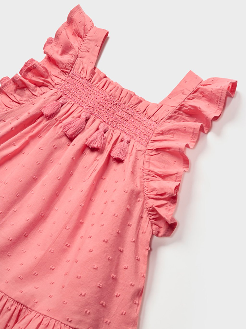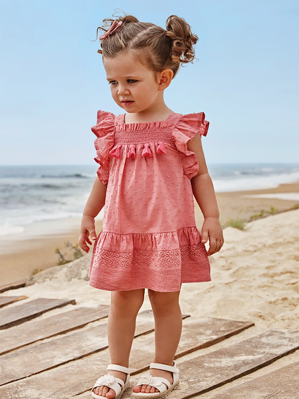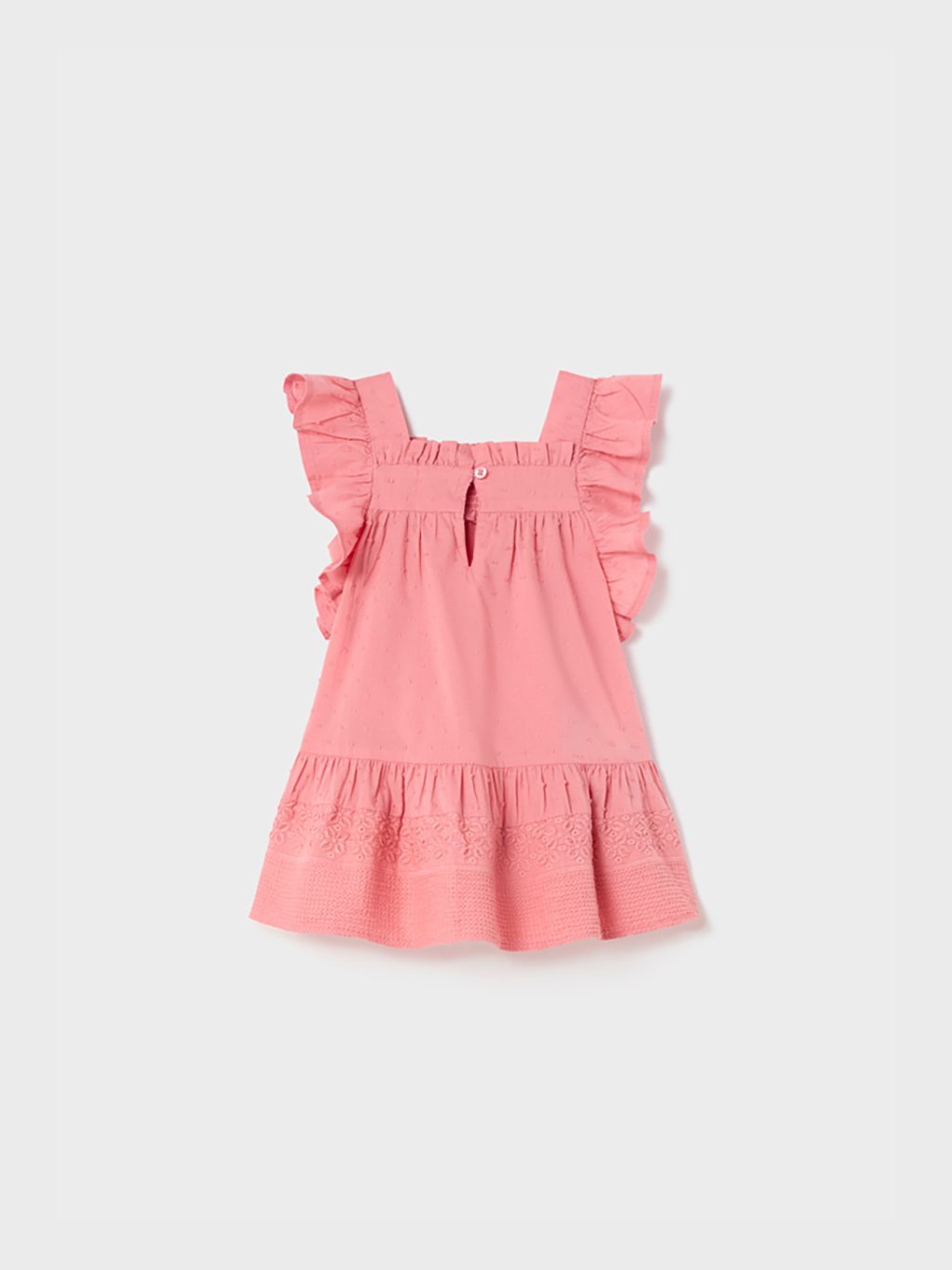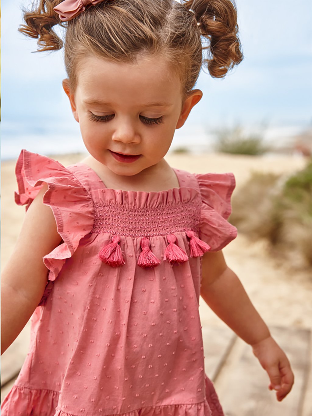 Dívčí letní šaty ze 100% bavlněné tkaniny. Malý otvor na zádech se zapínáním na knoflík pro snadnější oblékání. Ozdobné prvky: ozdobné volánky.