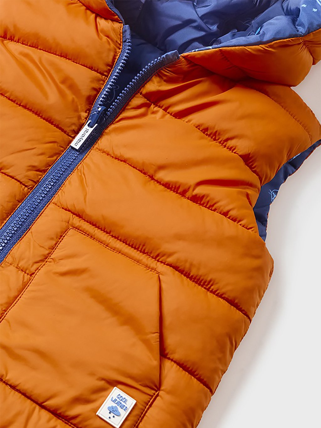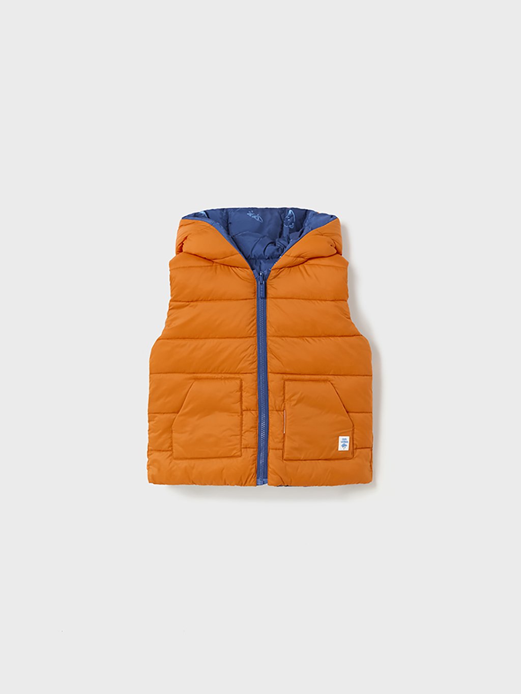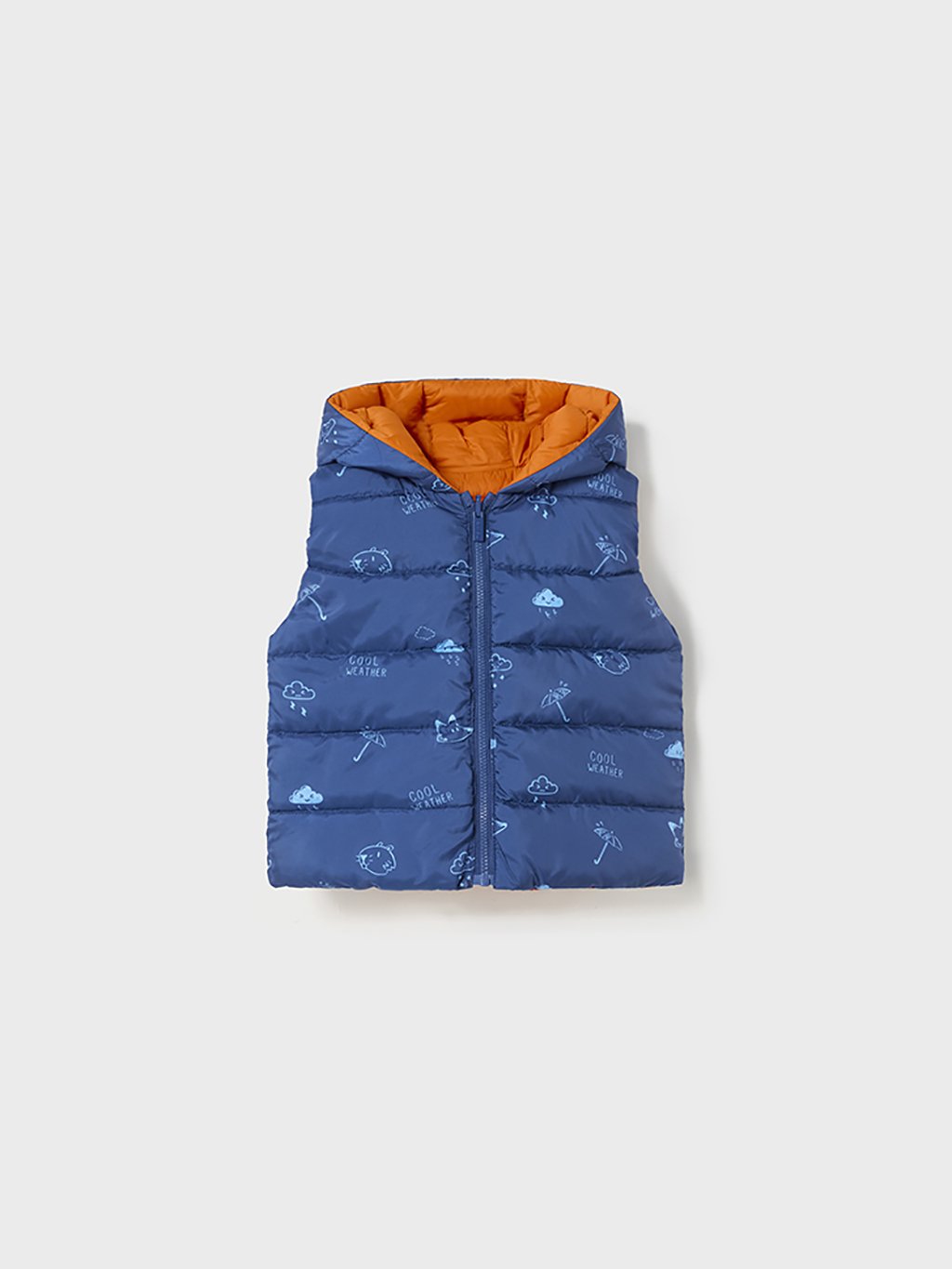 Chlapecká oboustranná vesta s kapucí a zapínáním na zip. Oranžová strana vesty má dvě kapsy na přední straně. Modrá strana vesty má potisk po celém oděvu.Doplňkové parametry