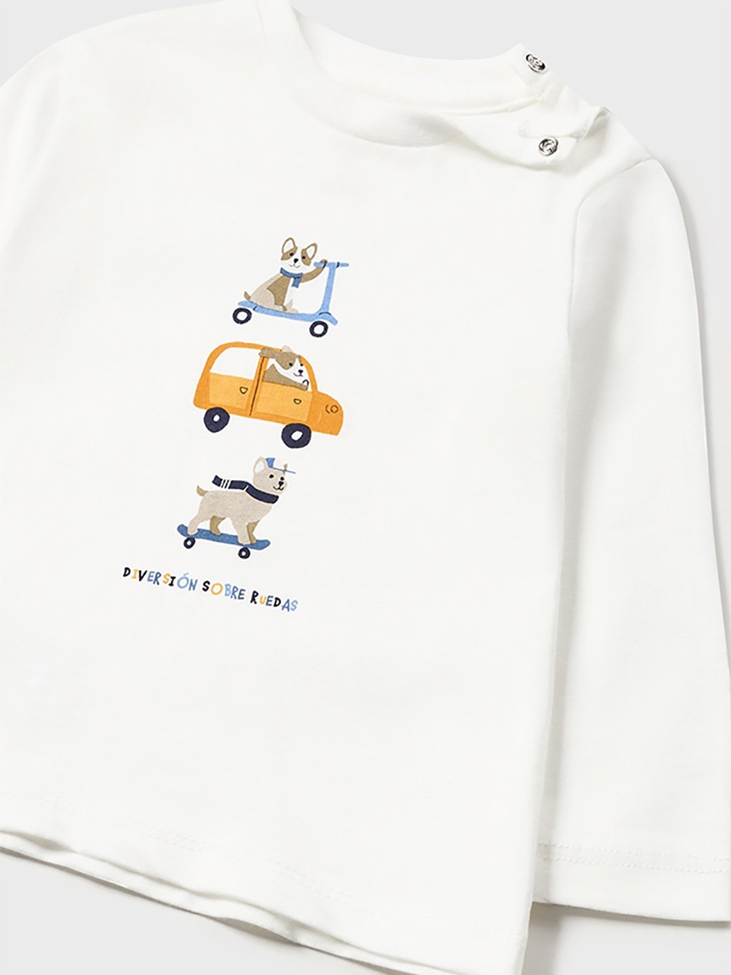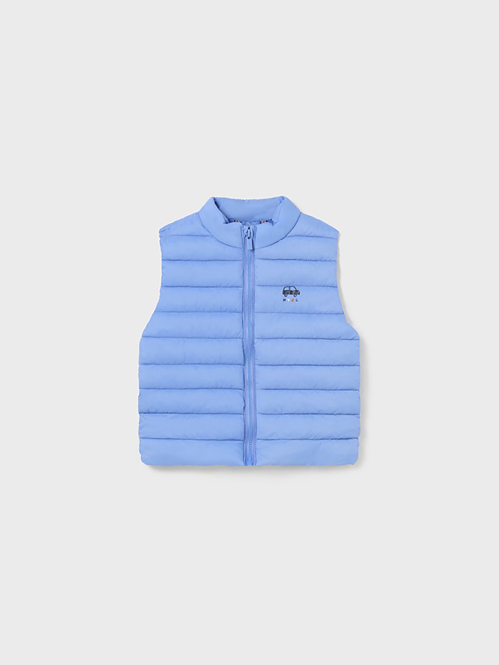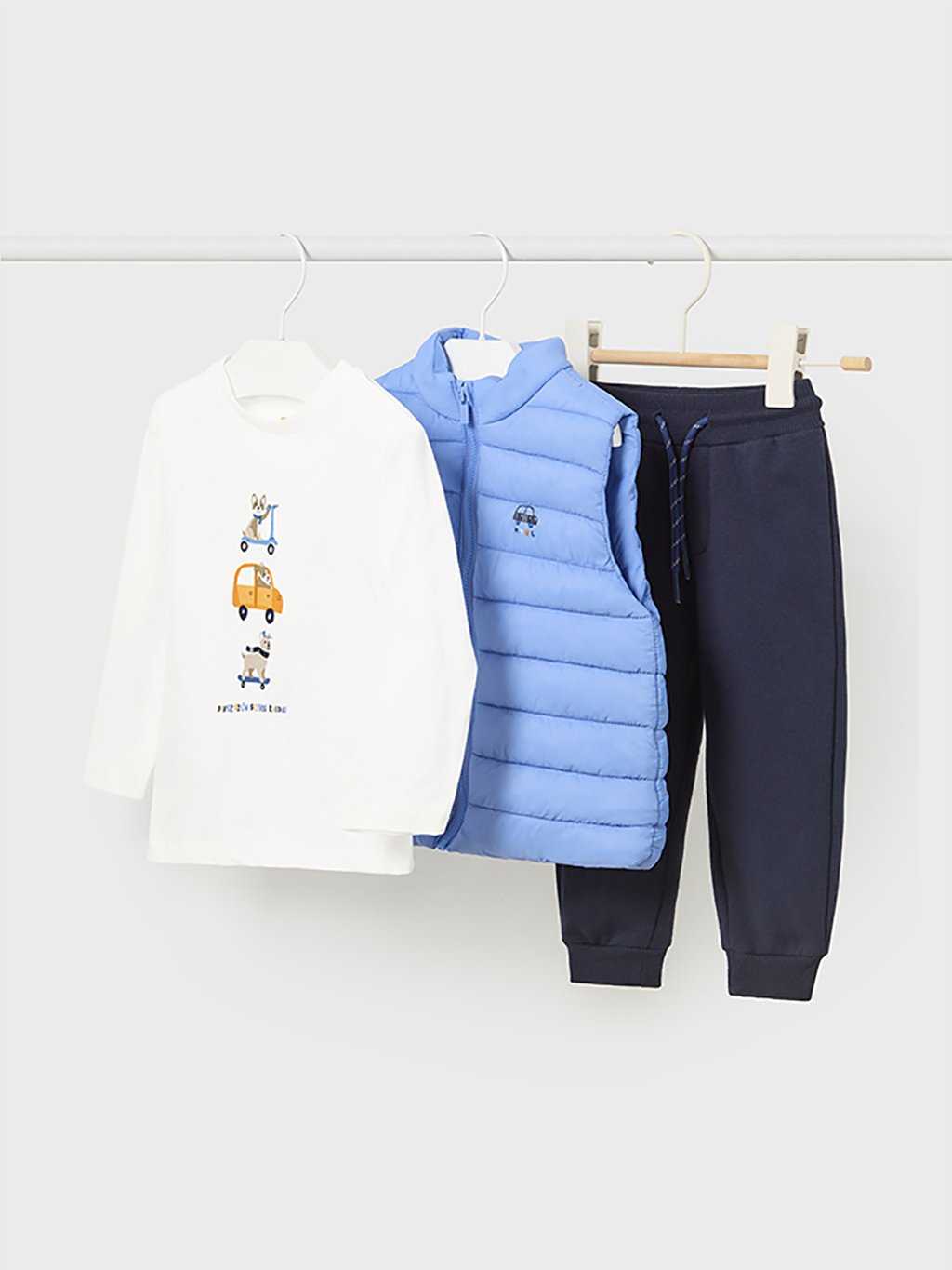 Chlapecká souprava složená z tepláků, trička a vesty. Tričko s dlouhým rukávem a kulatým výstřihem má zapínání na rameni. Chlapecké tričko má potisk na přední straně oděvu. Chlapecké tepláky s gumou v pase i u kotníků zajišťují větší komfort při nošení. Chlapecká prošívaná vesta se zapínáním na zip skvěle doladí celý outfit.Doplňkové parametry