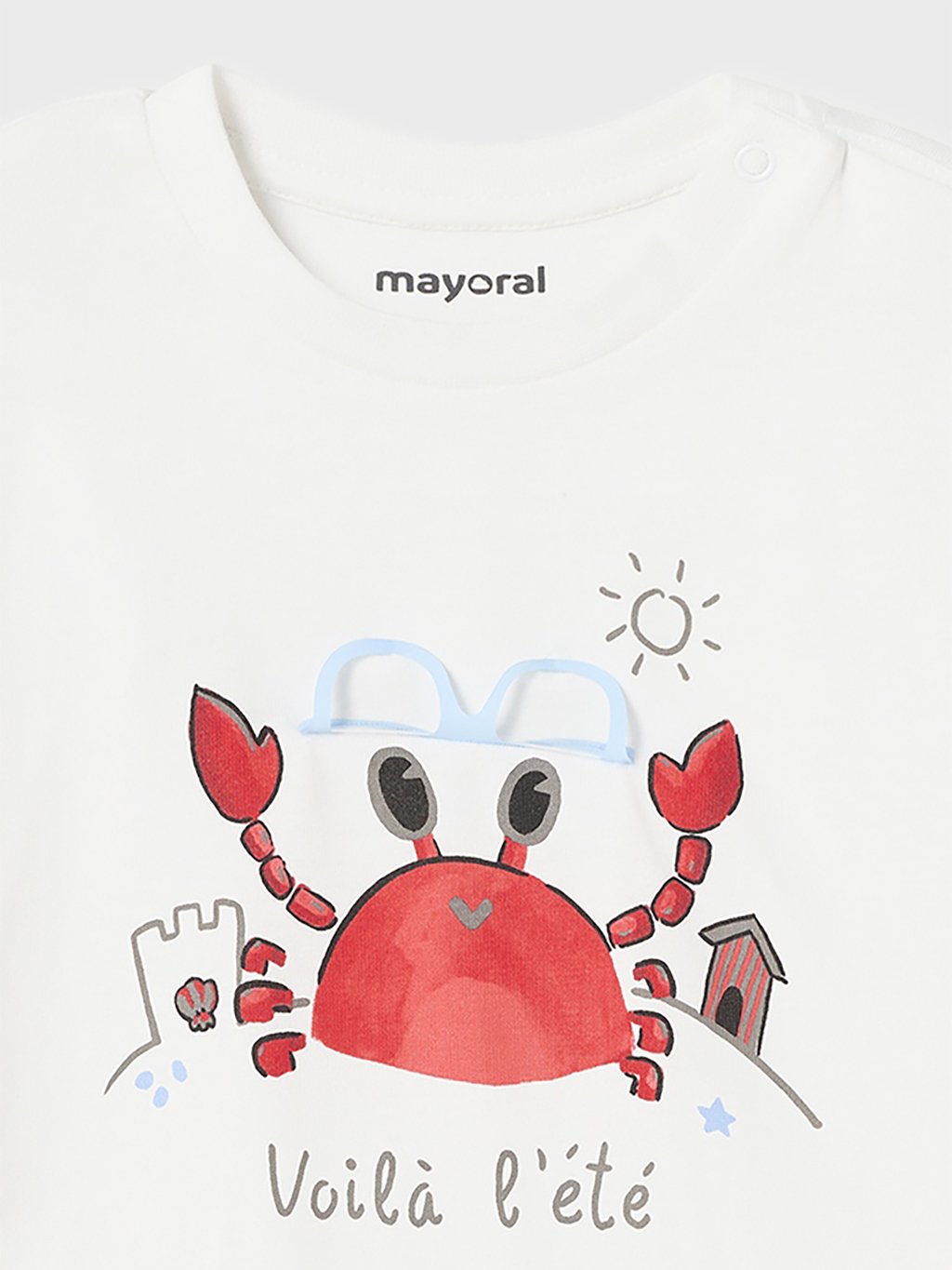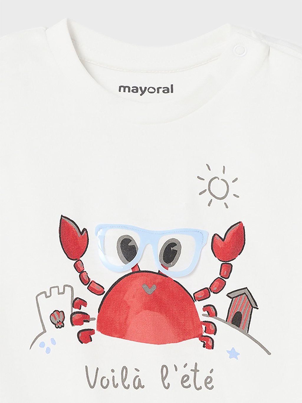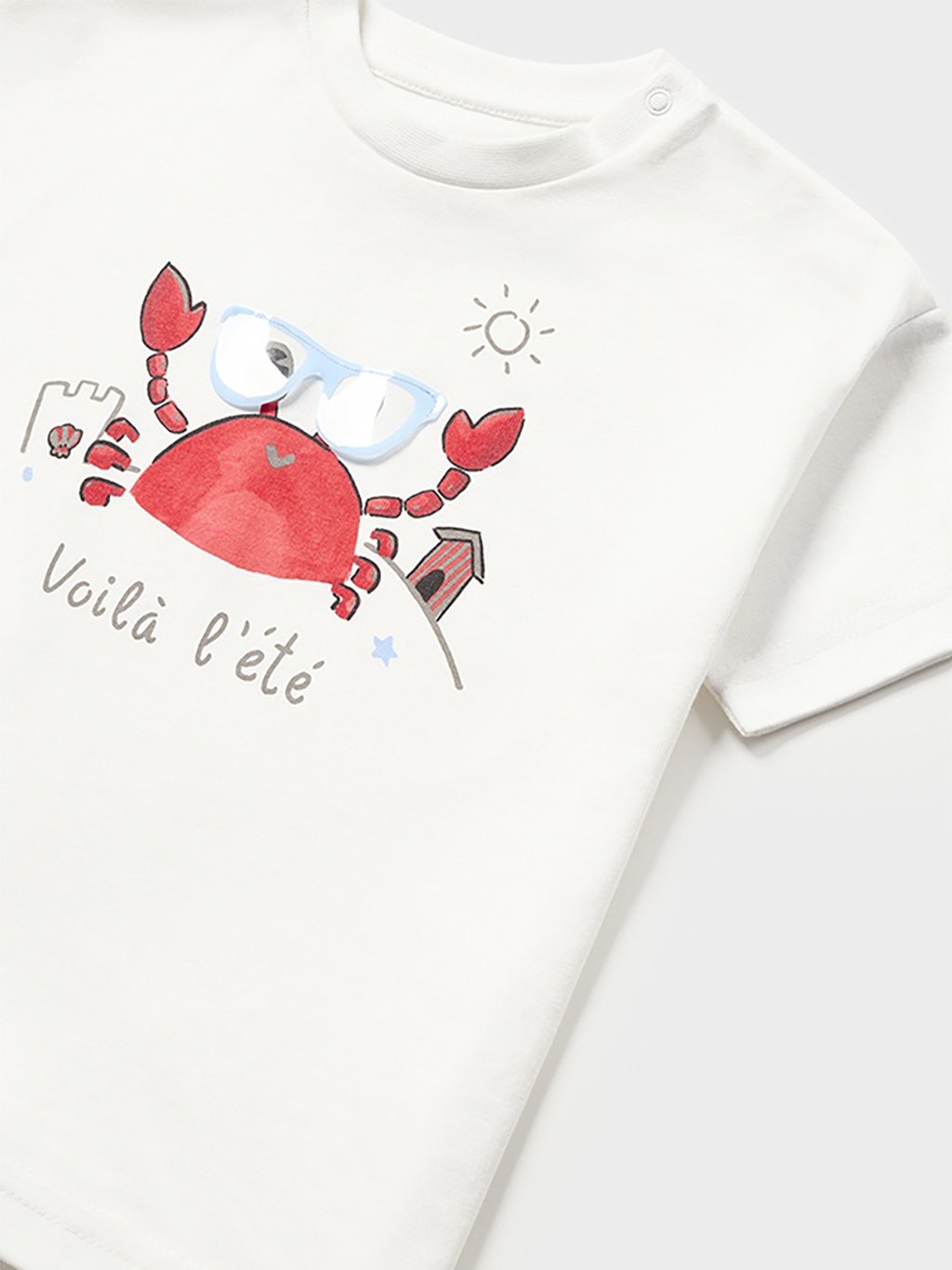 Tričko s krátkým rukávem a kulatým výstřihem. Zapínání na knoflík na rameni. 100% bavlněná tkanina. Triko s interaktivním motivem s pohyblivými částmi.Doplňkové parametry