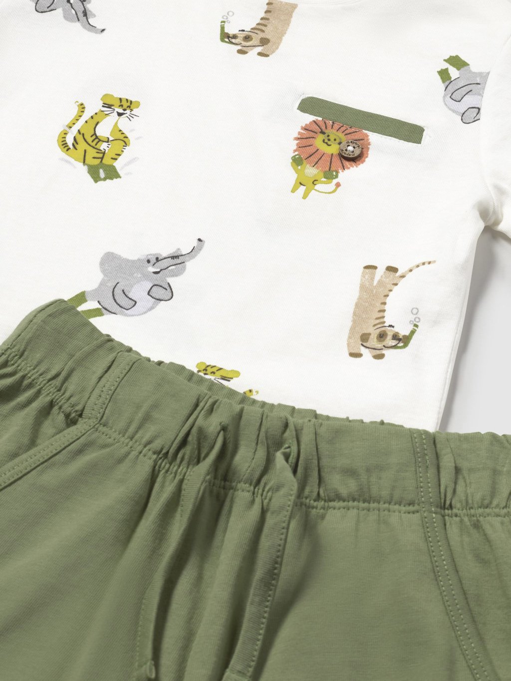 Chlapecký set dvou triček a kraťasů z kolekce safari. Chlapecká trička s krátkým rukávem a kulatým výstřihem. Kraťasy s elastickým pasem a stahovací šňůrkou. Funkční kapsy na přední straně.Doplňkové parametry