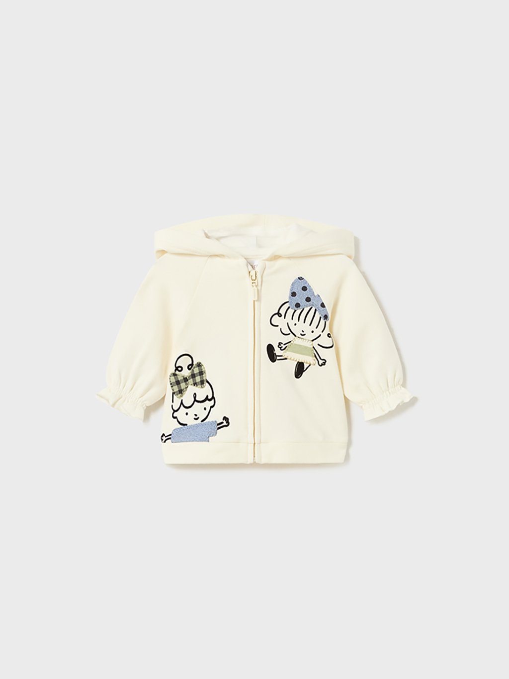 Dívčí souprava sestávající z trička, kalhot a mikiny. Tričko s kulatým výstřihem a zapínáním na zadní straně oděvu zdobí motiv na přední straně. Dívčí kalhoty mají gumu v pase a řasení u kotníků. Dívčí mikina s kapucí a řasením na spodní části rukávů. Kompletní set je skvělá kombinace pohodlí a stylu pro malé dívky.Doplňkové parametry