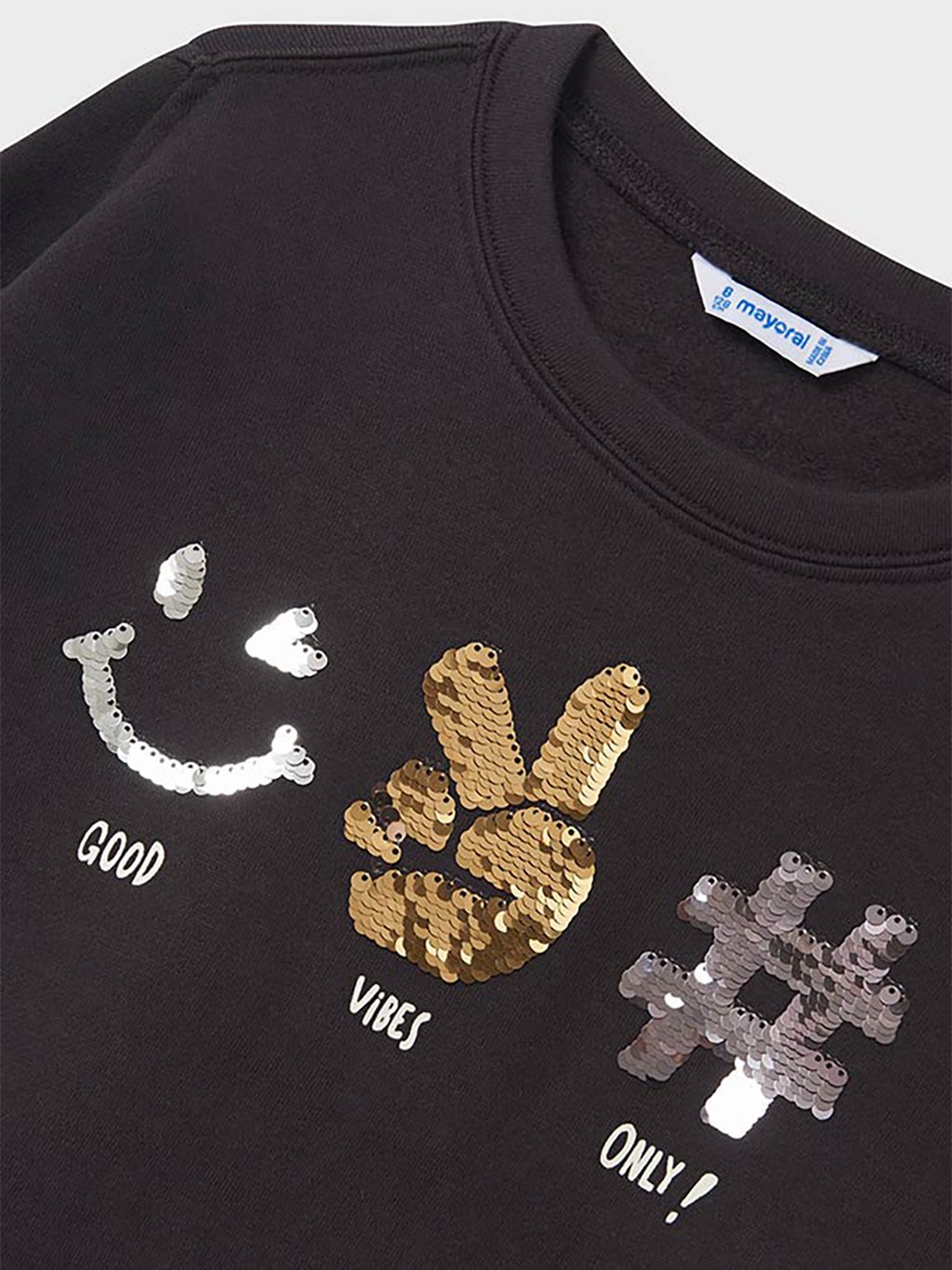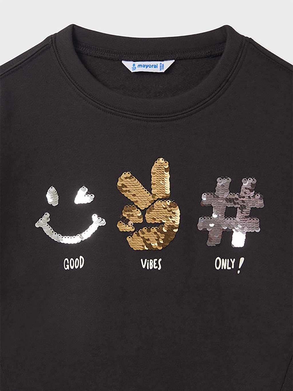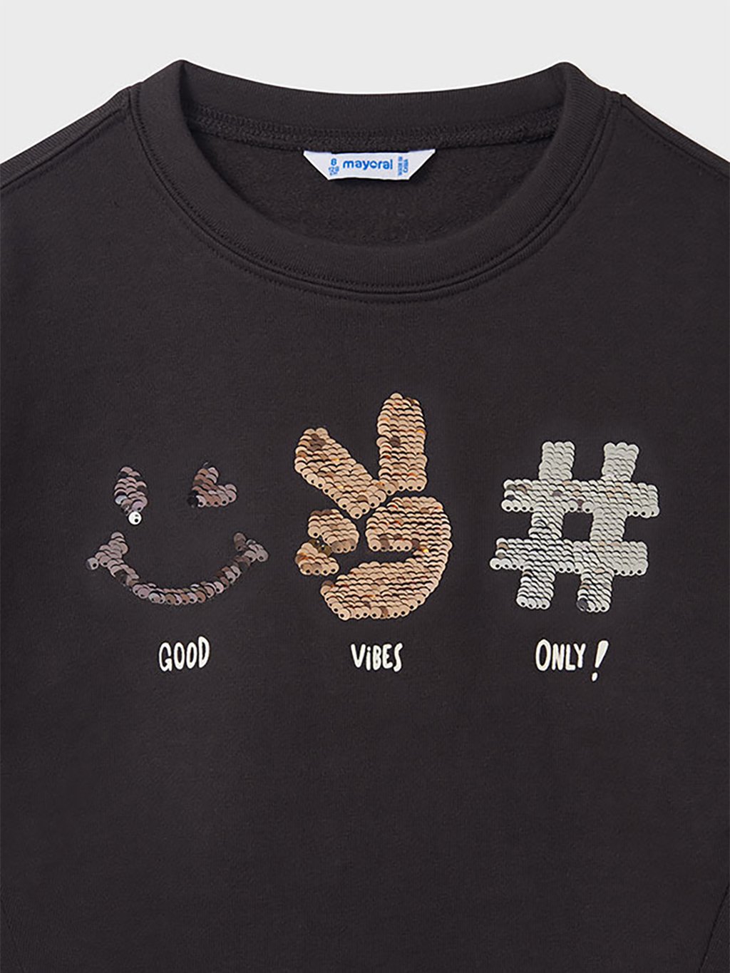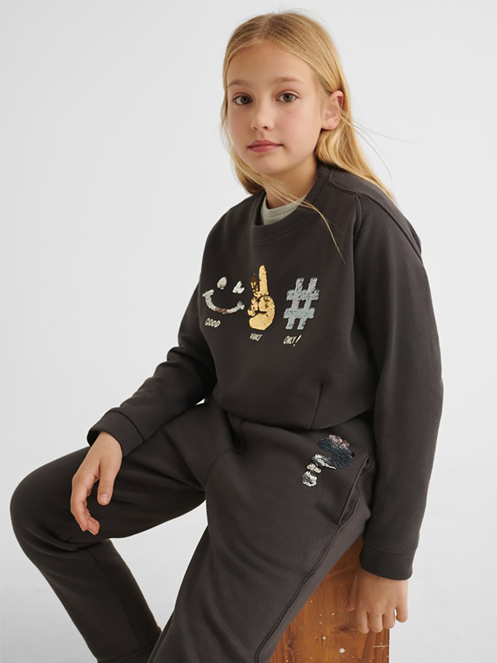 Dvoudílná tepláková souprava pro dívku s mikinou a dlouhými kalhotami. Dívčí mikina s dlouhým rukávem a interaktivní motivem s flitry. Dlouhé kalhoty mají elastický pas se stahovací šňůrkou.Doplňkové parametry