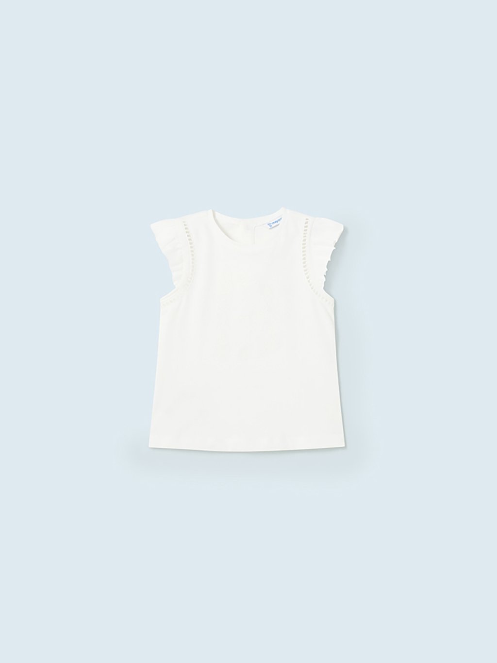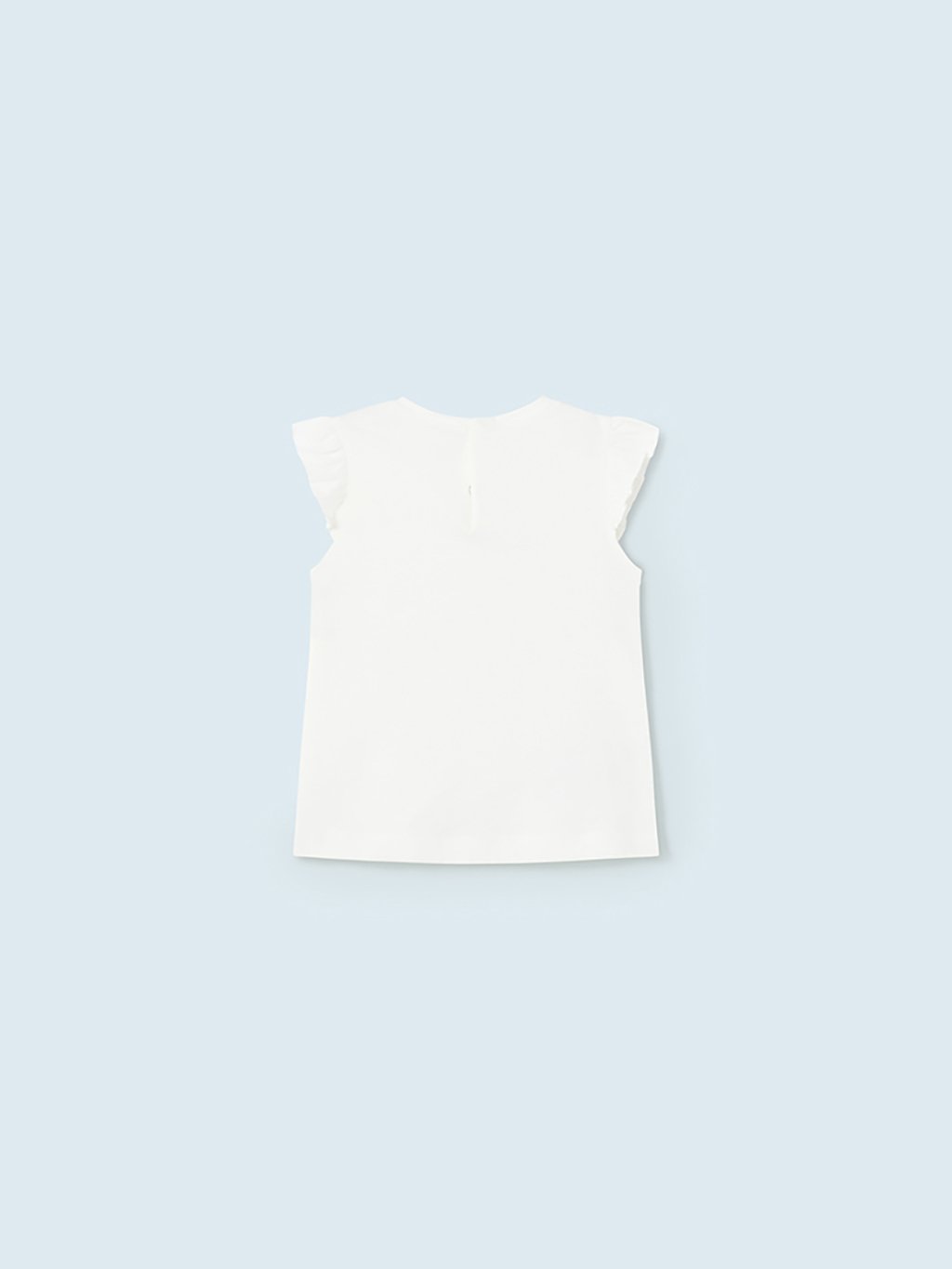 Triko ze 100% udržitelné bavlny. Dívčí triko s kulatým výstřihem. Zapínání na knoflík na zadní straně pro snadnější oblékání. Dekorativní prvky: výšivka, ozdobné volány.Doplňkové parametry