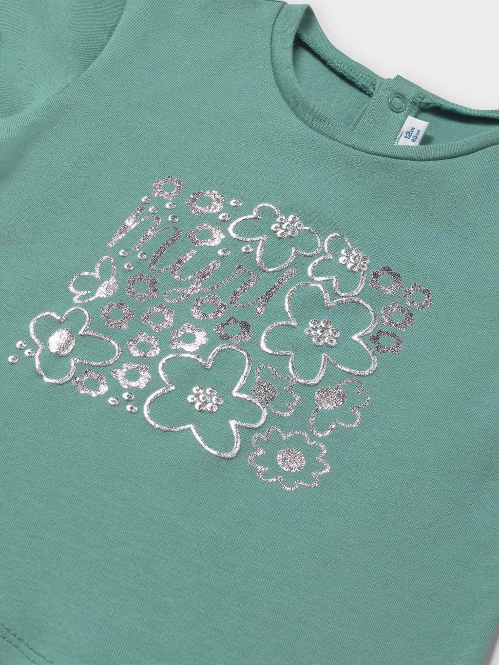 Dívčí triko se stříbrným potiskem květin. Krátký rukáv, na zádech knoflíčky pro jednodušší oblékaní přes hlavu.Doplňkové parametry