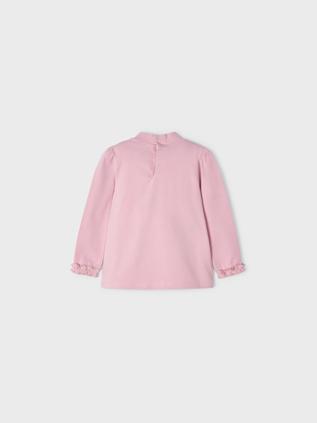 Dívčí tričko s dlouhým rukávem a stojáčkem. Tričko má zdobené rukávy. Zapínání na patentky na zádech. Produkt obsahuje udržitelnou bavlnu.Doplňkové parametry