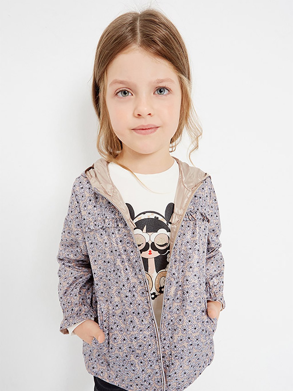 Dívčí oboustranná větrová bunda s dlouhým rukávem. Límec s kapucí. Přední středové zapínání na zip. Boční kapsy.Doplňkové parametry