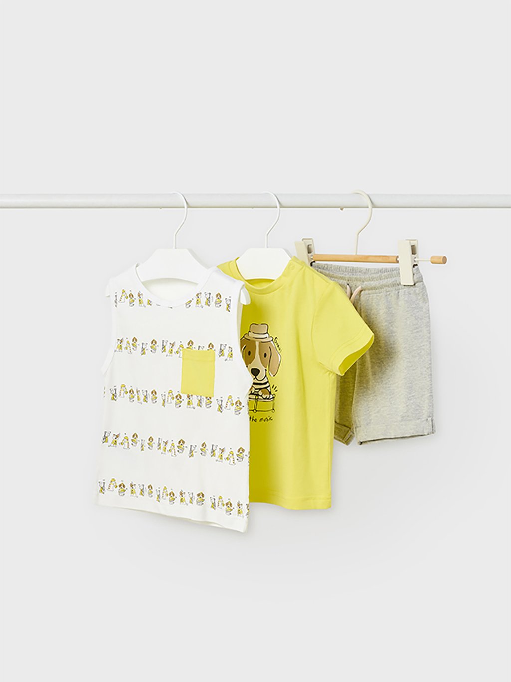 Třídílná souprava pro chlapce sestávající ze dvou triček a sladěných kraťasů. Tričko s krátkým rukávem a kulatým výstřihem. 100% bavlněná tkanina. Tílko s kulatým výstřihem je ze 100% udržitelné bavlny. Funkční kapsa na přední straně. Kražtasy s gumou a nastavitelnou šňůrkou v pase. Funkční kapsa na přední straně.Doplňkové parametry