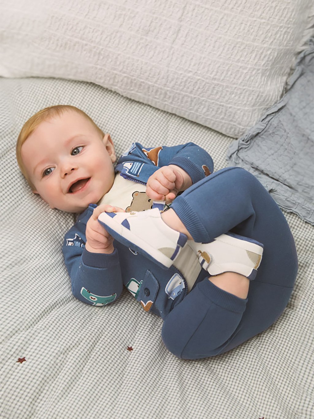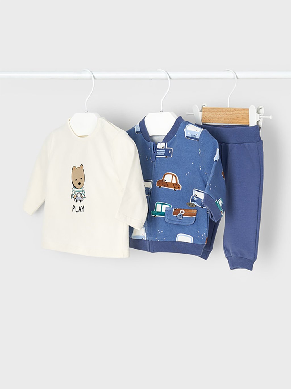 Třídílná tepláková souprava pro chlapečky sestávající z mikiny, dlouhých sportovních kalhot a ladícího trička. Mikina s dlouhým rukávem a zapínáním na zip. Tričko s dlouhým rukávem a zapínáním na rameni pro snadnější oblékání. Tepláčky s gumou v pase pro větší pohodlí.Doplňkové parametry