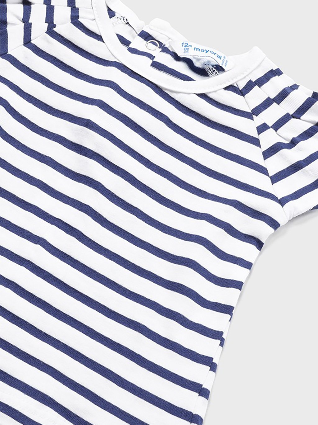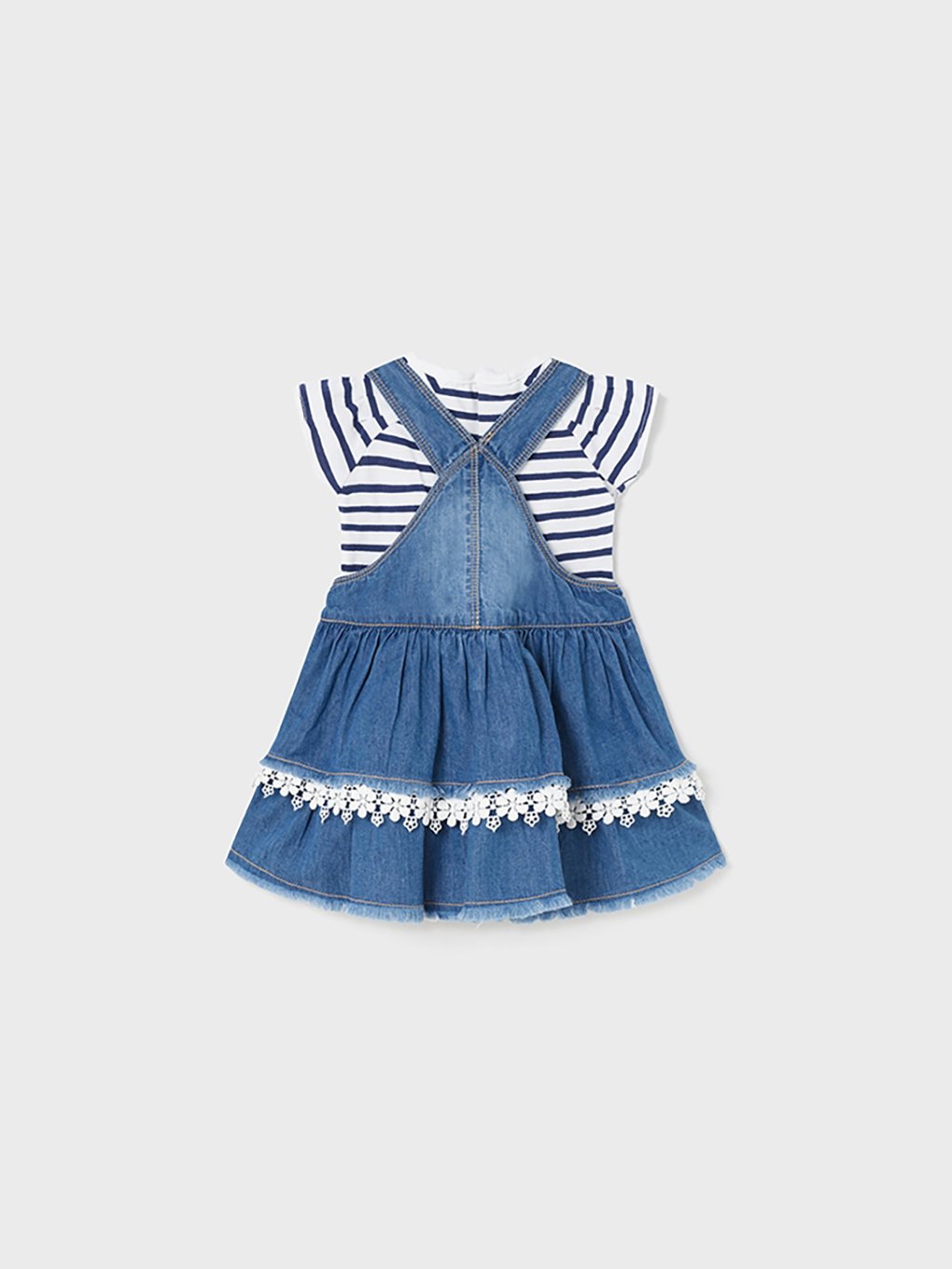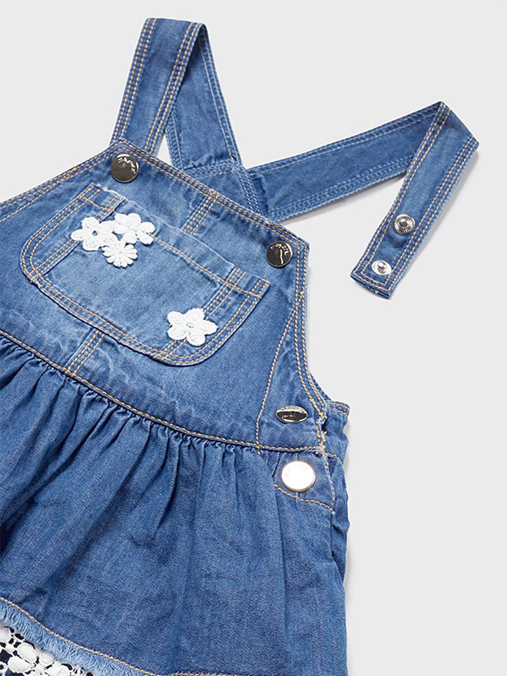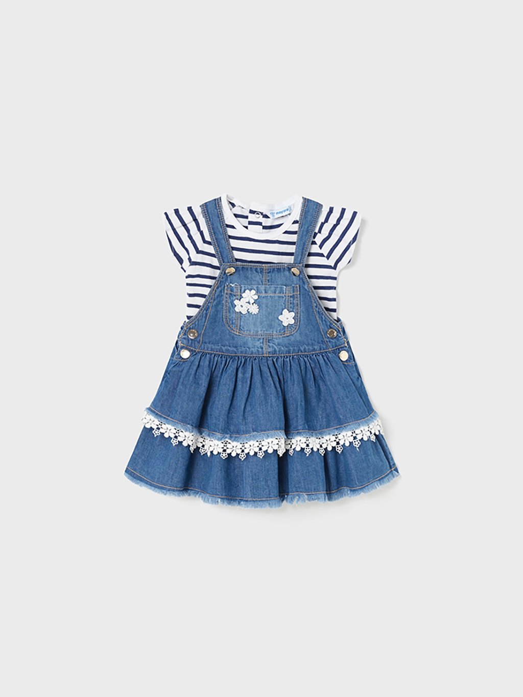 Originální set sukně s laclem a kombinovaným tričkem. 100% bavlněná tkanina. Pohodlná a kombinovatelná džínovina pro každodenní vzhled. Dekorativní prvky: ozdobné nášivky, ozdobné volánky. Tričko s krátkým rukávem a zapínáním na knoflík na zadní straně pro snadnější oblékání.Doplňkové parametry