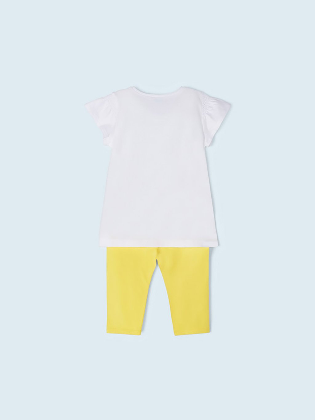 Set trička a legín pro dívku. Dívčí tričko s krátkým rukávem a volánovými detaily. Kulatý výstřih. 100% bavlněná tkanina. Legíny s elastickým pasem pro lepší přizpůsobení postavě. Měkká strečová bavlněná tkanina.Doplňkové parametry