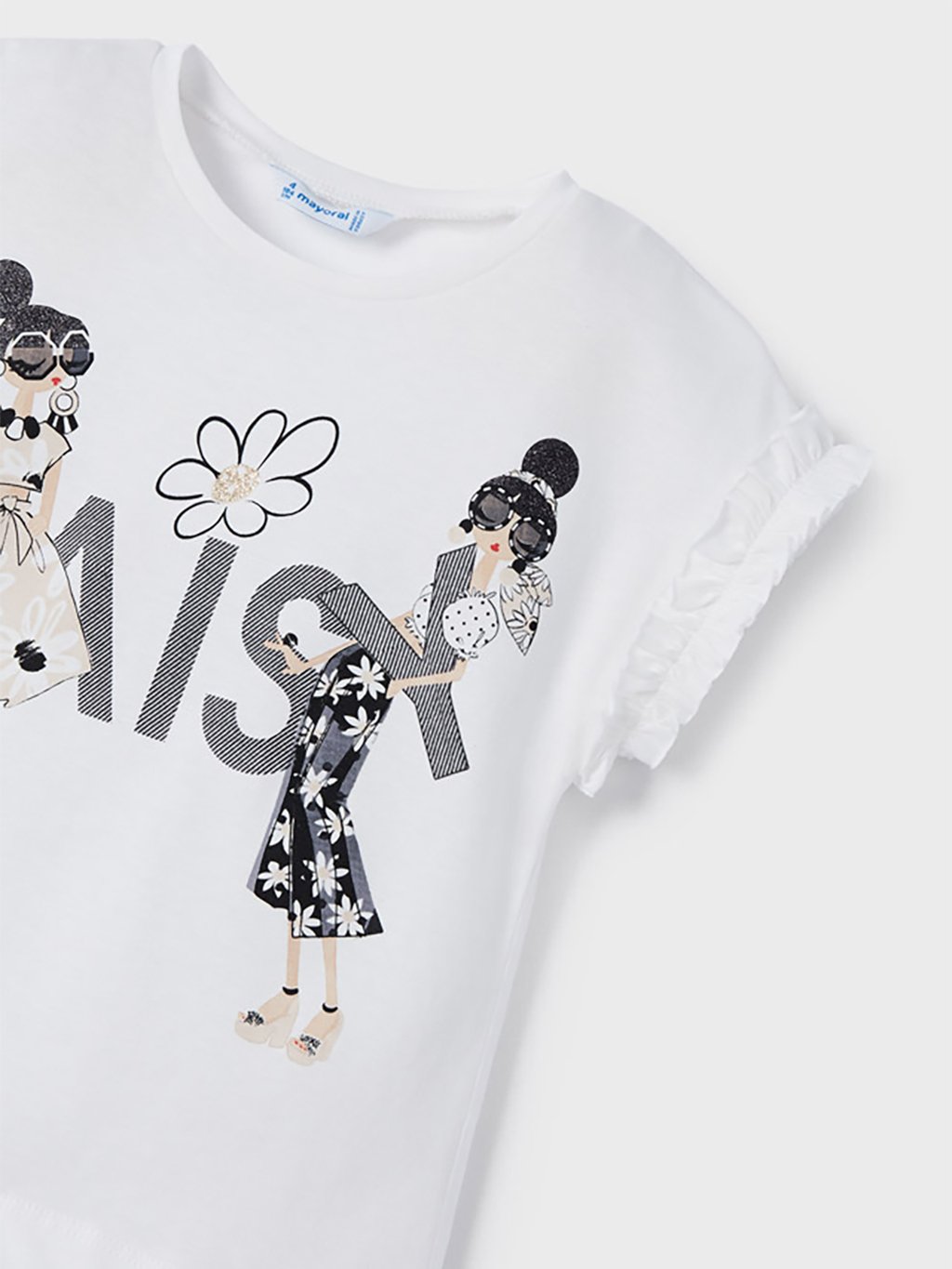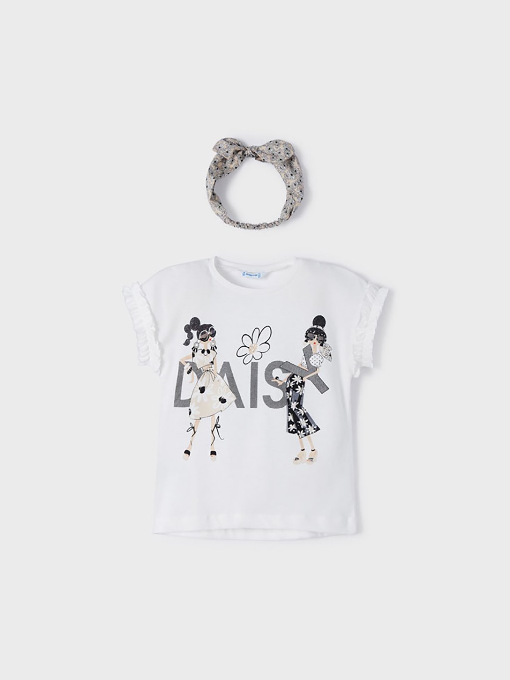 Souprava ze 100% udržitelné bavlny. Tričko s krátkým rukávem pro dívky. Originální čelenka pro dívku, perfektní jako doplněk k doladění outfitu. Dekorativní prvky: mašle.Doplňkové parametry