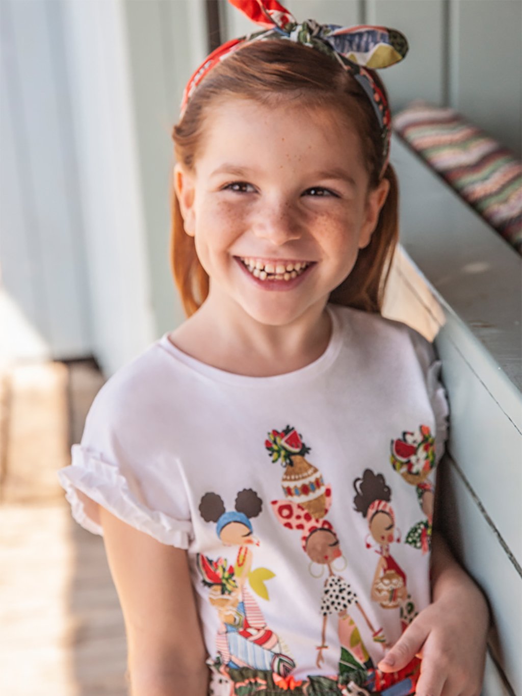 Souprava ze 100% udržitelné bavlny. Tričko s krátkým rukávem pro dívky. Originální čelenka pro dívku, perfektní jako doplněk k doladění outfitu. Dekorativní prvky: mašle.Doplňkové parametry