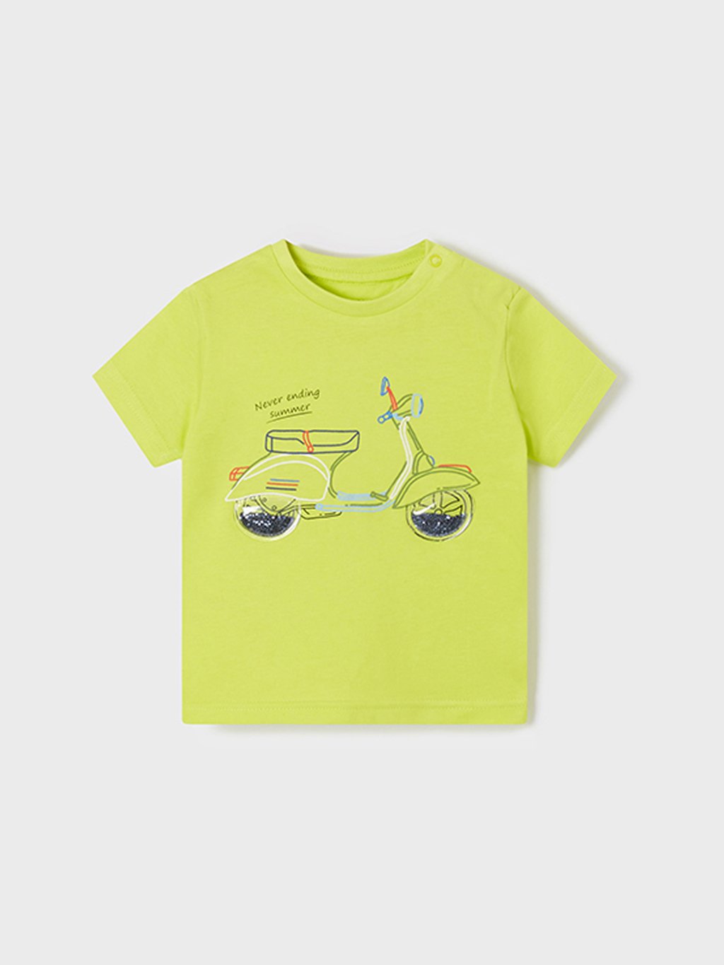 Tričko s krátkým rukávem a kulatým výstřihem pro chlapečka. Zapínání na patentky na rameni pro snadnější oblékání. Ozdobné prvky: ozdobné aplikace, třpytky.Doplňkové parametry