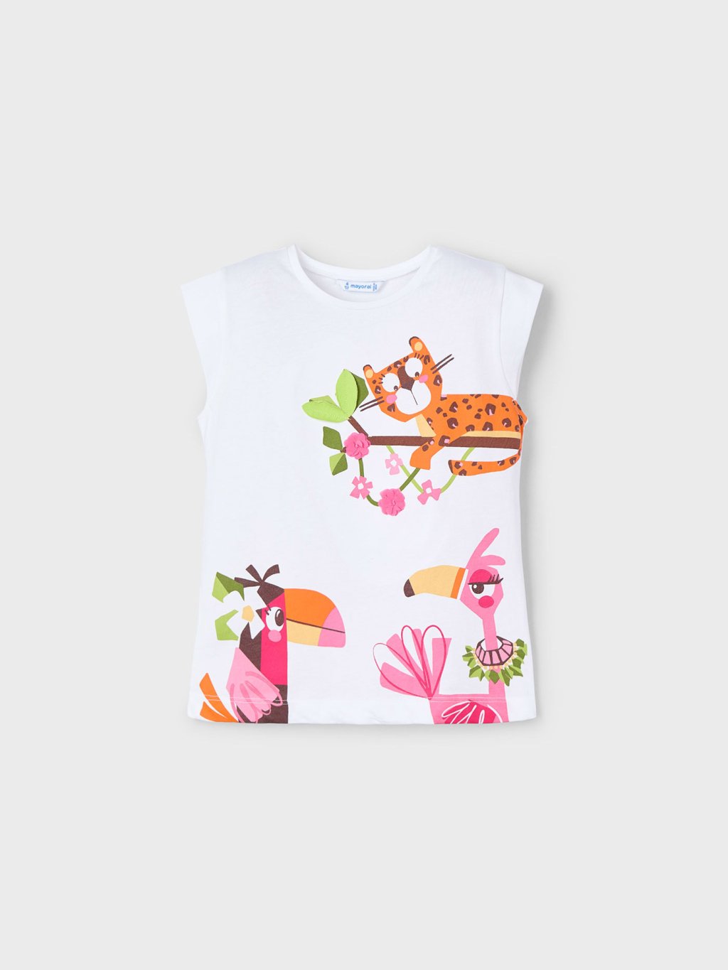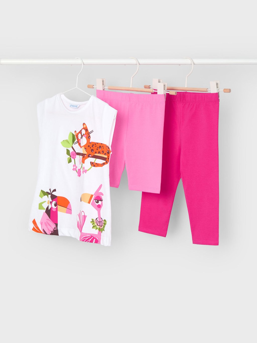 Třídílný dívčí set sestávající se z trička, legín a kraťasů. Tričko s krátkým rukávem a potiskem. Legíny a kraťasy s gumou v pase pro větší komfort při nošení.Doplňkové parametry