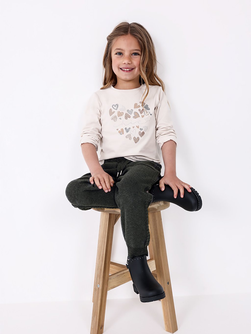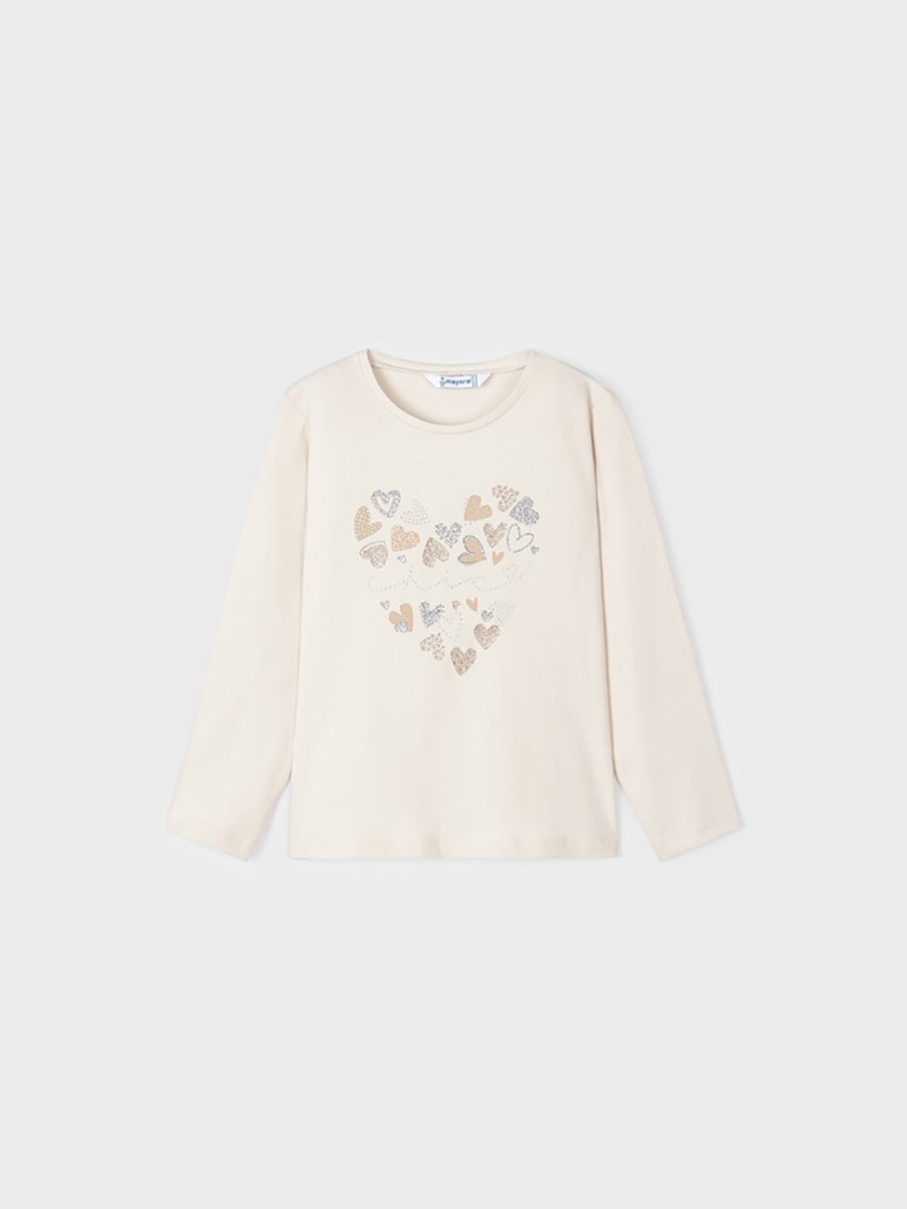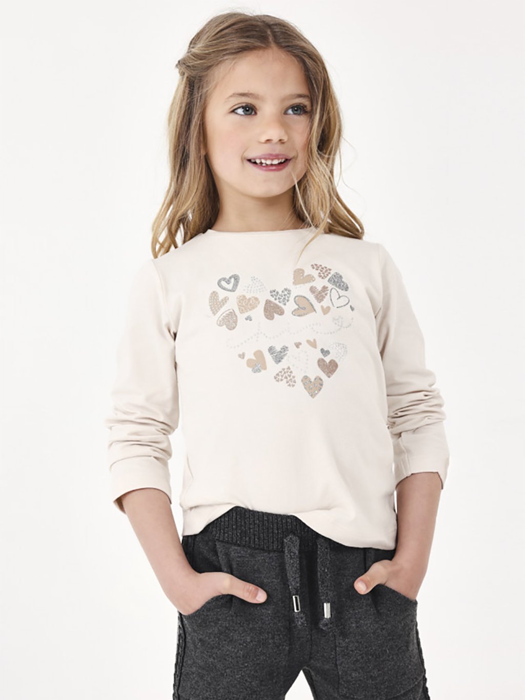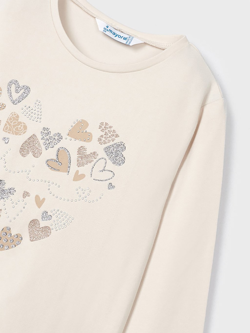 Triko s dlouhým rukávem pro slečny. Triko má kulatý výstřih a lesklý potisk se srdíčky. Na přední straně jsou ozdobné kamínky.Doplňkové parametry