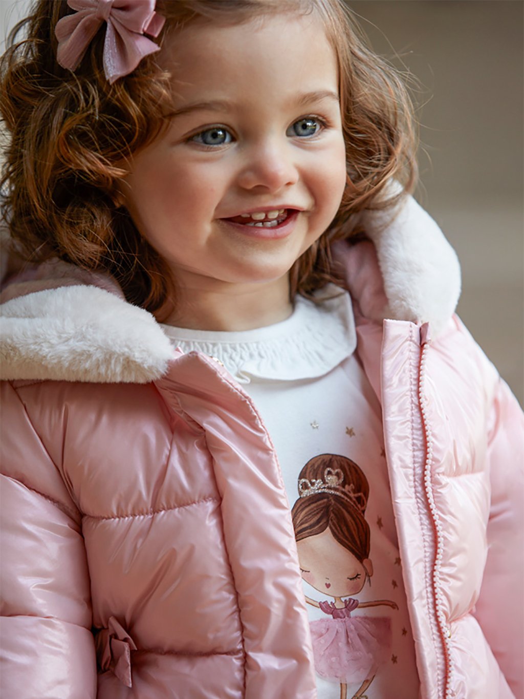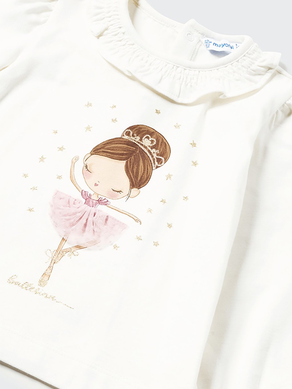 Dívčí triko s dlouhým rukávem a kulatým výstřihem. Kolem výstřihu je ozdobný kanýr. Nařasené rukávy mají na koncích volány. Na dívčím triku je lesklý potisk s 3D sukýnkou. Zapínání na zadní straně usnadní oblékání.Doplňkové parametry